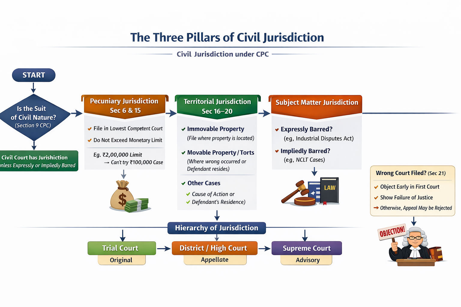 A deep dive into the types of jurisdiction under the Code of Civil Procedure, 1908. Learn the essential rules of Pecuniary, Territorial, and Subject Matter jurisdiction with a focus on Sections 16, 17, and 18.