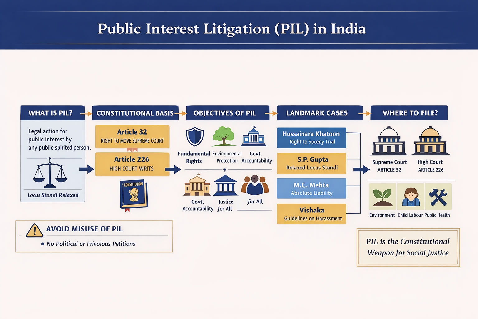 Public Interest Litigation (PIL) has revolutionized the Indian legal system law notes. Explore its evolution from the 1970s, the contribution of Justice P.N. Bhagwati, and essential landmark cases like Hussainara Khatoon and M.C. Mehta in this detailed student guide.