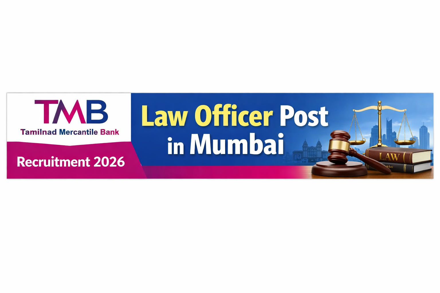 Tamilnad Mercantile Bank (TMB) is inviting applications for the post of Law Officer in Mumbai. Eligible candidates with a BL/ML degree and 2–4 years of experience must apply by February 09, 2026.