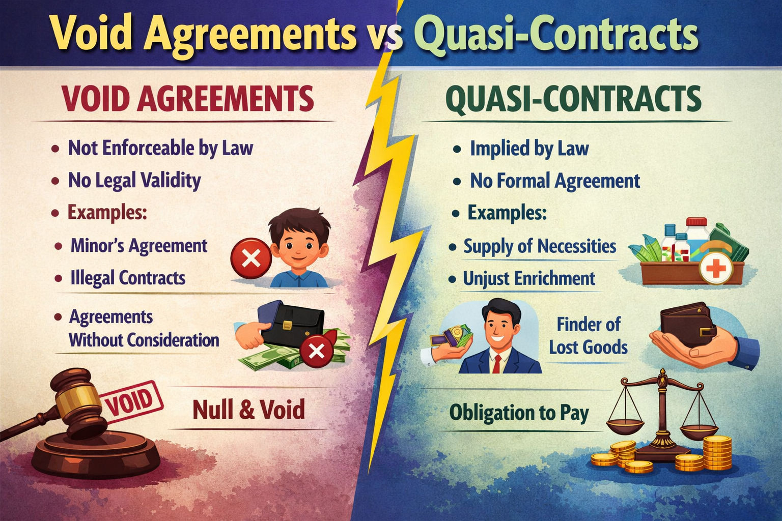 In the intricate world of contracts, not all agreements are created equal. While some form the bedrock of legal enforceability, others are, from the very beginning, destined to be legally meaningless. This brings us to two crucial, yet distinct, concepts under the Indian Contract Act, 1872: Void Agreements and Quasi-Contracts.